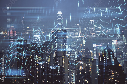 Double exposure of forex chart drawings over cityscape background. Concept of success.