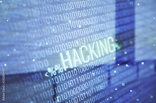 Double exposure of hacking theme hologram on empty exterior background. Data security concept