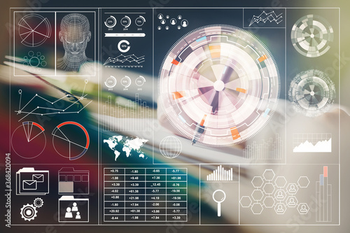 Double exposure of hands making notes background with technology and digital coding huds. Data learning concept.