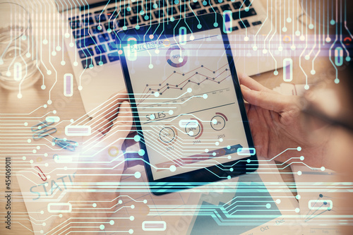 Double exposure of man's hand holding and using a digital device and data theme hologram drawing. Technology concept.