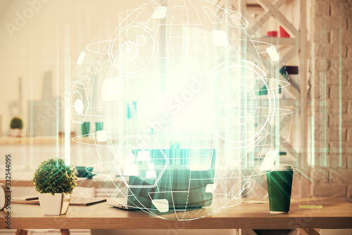 Double exposure of social network theme drawing and office interior background. Concept of web.