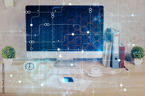 Double exposure of table with computer on background and data theme hologram. Data technology concept.