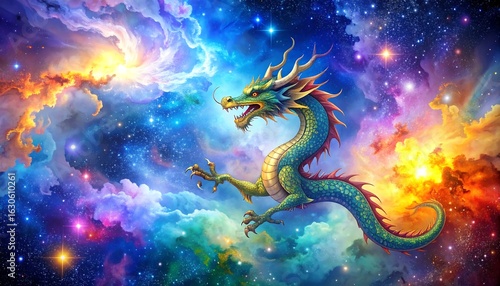 Dragon soaring through nebula
