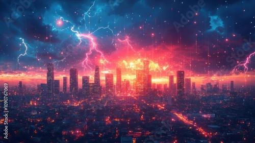 Dramatic cityscape with lightning and vibrant sunset colors.