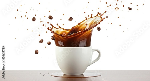 Dramatic Coffee Splash in White Cup with Flying Coffee Beans on White Background