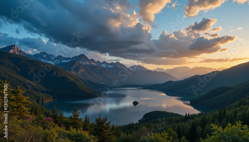 Dramatic sunset over mountain lake reflection on the water