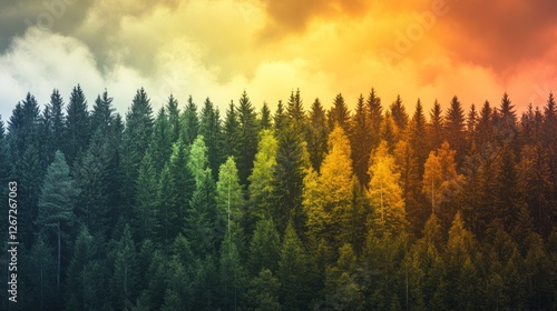 Dramatic woodland scene displaying vibrant autumnal hues under a colorful sky
