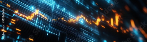 Dynamic abstract digital background featuring glowing blue and orange lines and patterns. Ideal for technology and data projects.