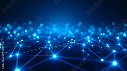 Dynamic abstract network design featuring interconnected lines and geometric shapes on a deep blue gradient background