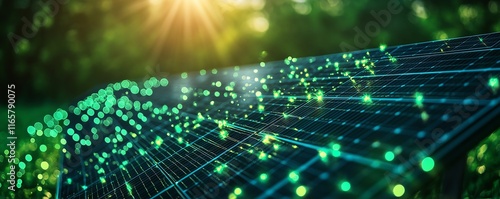 Dynamic abstract tech background showcasing ESG values, ecofriendly patterns, solar panels, and innovative digital grids