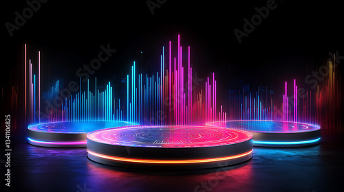 Dynamic audio visual performance studio digital art dark environment wide angle vibrant light patterns