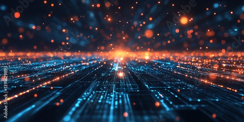 Dynamic Blue and Orange Light Display Across a Digital Landscape Showcasing Advanced Technology and Data Flow