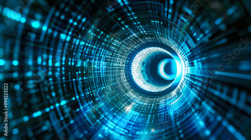 Dynamic blue digital tunnel visualizing data flow through a futuristic network environment