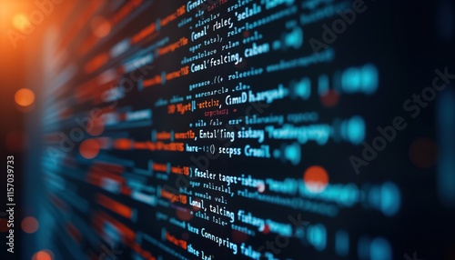 Dynamic coding display shows data encryption algorithms. Secure tech system displays code. Coding data encryption system in progress. Digital data flows. Intricate coding process for digital