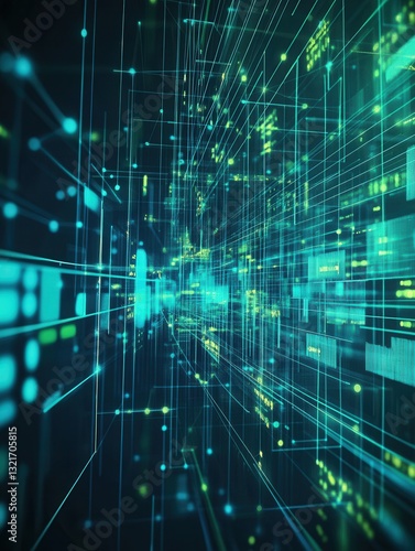 Dynamic data grid with intersecting trend lines representing political and economic analysis in blue and green tones for trust and intelligence