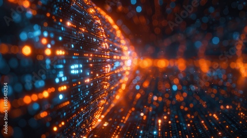 Dynamic digital data stream with glowing blue and orange lights, representing technology, communication, and network speed.