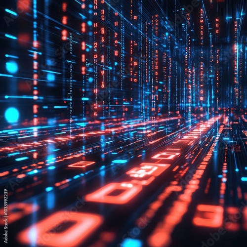 Dynamic digital landscape with glowing neon lines and binary data, representing technology and modern innovation.