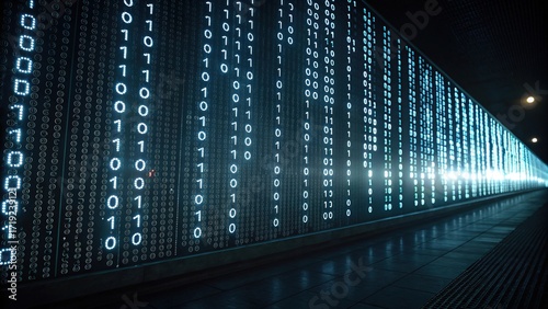 Dynamic display of binary code flowing across a dark screen in an abstract futuristic environment
