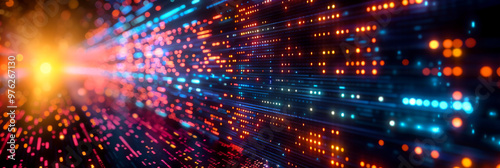 Dynamic flowing binary code and algorithms converge into vibrant display of light and color, creating mesmerizing visual experience that evokes sense of technological advancement and innovation