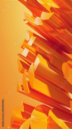 Dynamic graphic poster with vibrant orange segments levitating, arranged in a spiral pattern, surrounded by expansive negative space