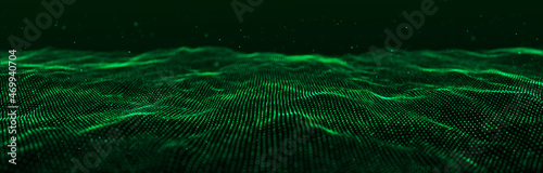 Dynamic green particle wave. Futuristic point wave. Flow digital structure. Data technology background. 3D rendering.