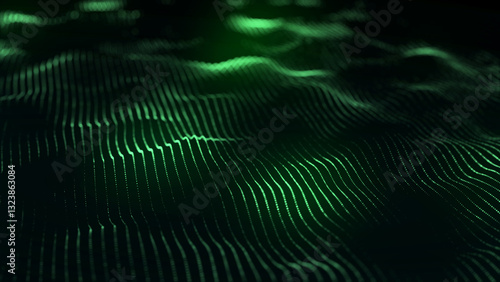 Dynamic green wave of particles and lines. Abstract futuristic background. Big data visualization. 3D rendering.