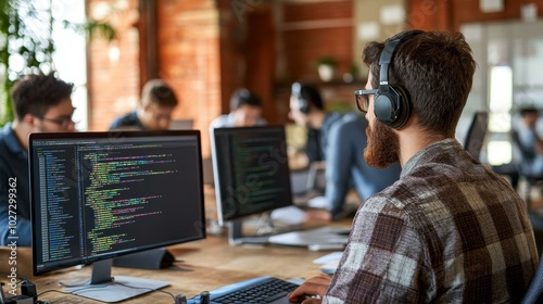 Dynamic Office Environment Showcasing Innovative Tech Team Engaged in Collaborative Software Development