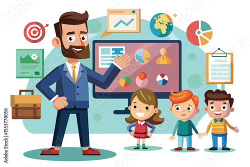 Dynamic presentation featuring an engaging teacher and enthusiastic students with visual aids in a classroom setting
