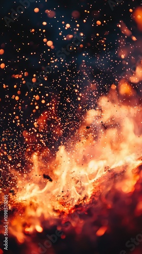 Dynamic Scene of Rising Orange and Red Particles from Flames in a Fire Setting, Capturing the Essence of Heat and Energy in Natural Elements