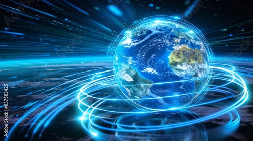 Earth from space with digital network lines and data paths in a cyber-tech design