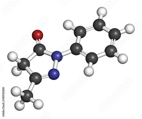Edaravone drug molecule. 3D rendering. Atoms are represented as spheres with conventional color coding: hydrogen (white), carbon (grey), nitrogen (blue), oxygen (red).
