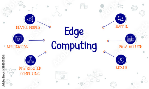 Edge computing concept vector isolated in white background with blue icons and text for device nodes, application, distributed computing, traffic, data volume and costs.