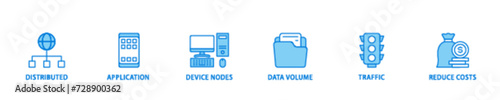 Edge computing icon set flow process illustrationwhich consists of distributed computing, application, device nodes, data volume, traffic and reduce costs icon live stroke and easy to edit