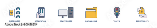 Edge computing icons set collection illustration of distributed computing, application, device nodes, data volume, traffic and reduce costs icon live stroke and easy to edit