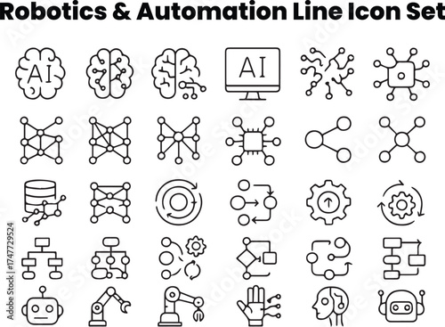 Editable black and white line vector icons showing AI brains, neural networks, algorithms, and smart automation systems. Ideal for digital transformation, robotics, and data science visuals