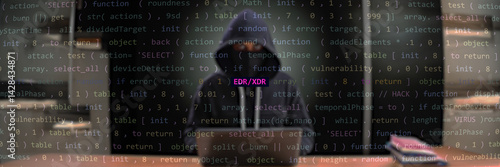 Edr Xdr text in foreground screen, Anonymous hacker hidden in the blurred background. Vulnerability text in binary system ascii art style, code on editor screen. Text in English
