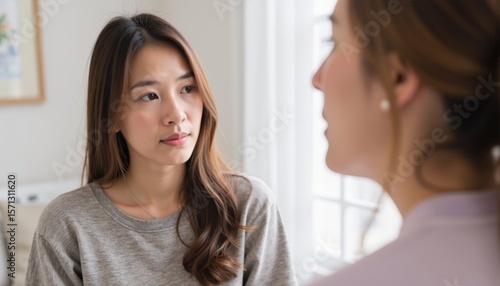 Effective psychotherapy. A woman listens intently during a conversation with another person.