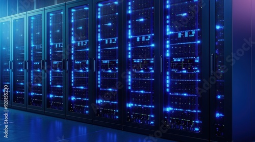 Efficient Data Center: 3D Clay Illustration of Servers with Blue LED Lights and Cooling Systems on Dark Background