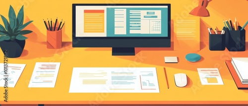 Efficient Workspace with Project Planning Documents and Digital Tools for Text Placement - Flat Design