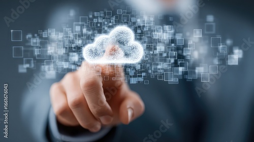 Effortless cloud connectivity with glowing digital cloud and hand, perfect for modern tech solutions and innovative business strategies, symbolizing data and networking