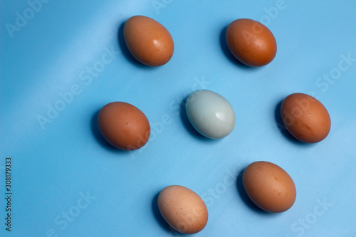 eggs isolated on blue background, copy space