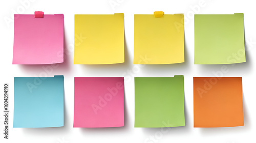 Eight colorful sticky notes on a white background ready for messages or reminders