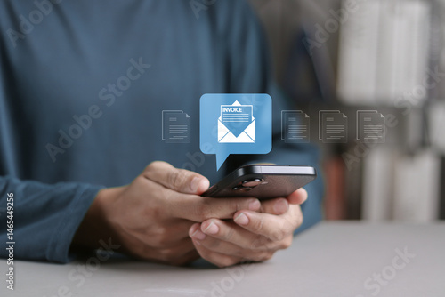 E-Invoice and online digital statements by email concept. Person using smartphone with email invoice document icon on virtual screen.
