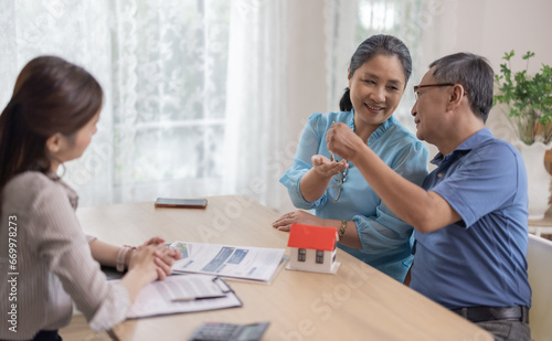 Elderly couples satisfying retirement home purchase with contract and key handover from a saleswoman