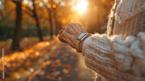 Elderly person using a fitness tracker during a morning walk Stock Photo with copy space