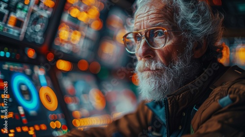 Elderly programmer engrossed in coding, tech-savvy, late night, soft ambient lighting, digital era narrative, AI Generative