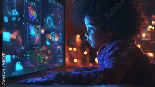 E-leaning concept. child using a language learning platform, vibrant digital interface with animated characters teaching the child.