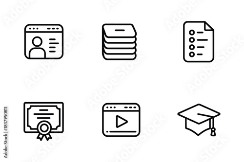 E-learning and education icons set including profile, documents, certificate, and graduation cap