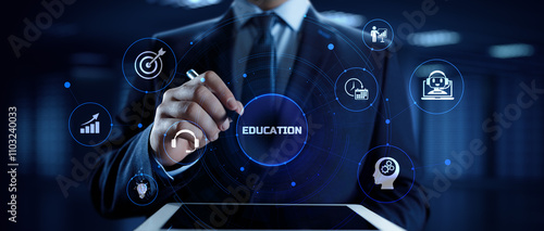 E-learning distance education concept. Businessman pressing button on screen.