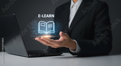 E-learning education platform. Open book icon with digital learning symbol. Online training and course access via virtual interface